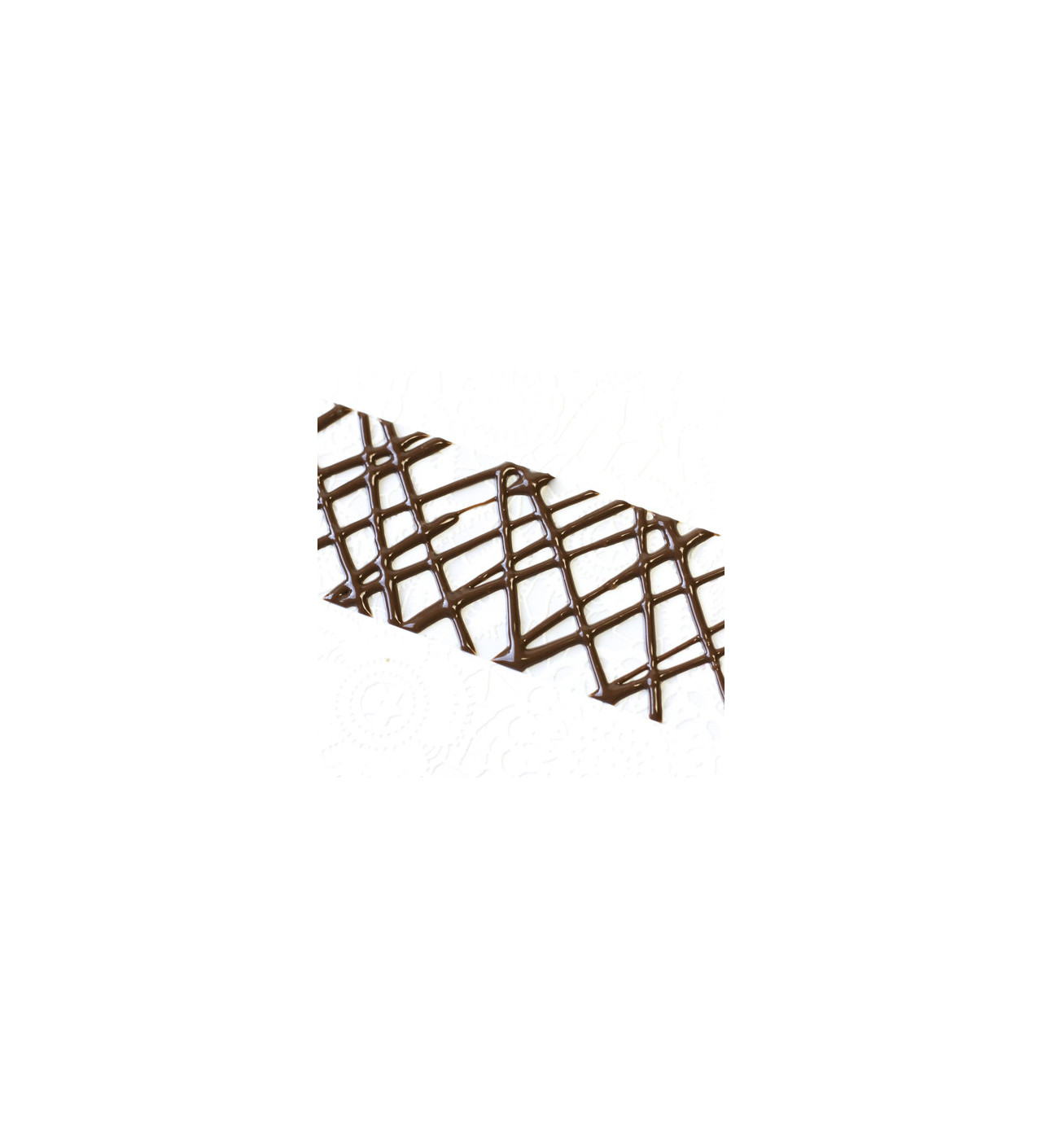 Découpez une bande Rhodoïd puis à l'aide d'une fourchette, répandez dessus du chocolat tempéré en faisant des mouvements de va-et-vient. Si besoin, vous pouvez replier le Rhodoïd afin de former un tube ou un ruban. Pour le garder fermé, utilisez une pince à linge. Une fois que le chocolat a cristallisé, enlevez délicatement le Rhodoïd.