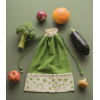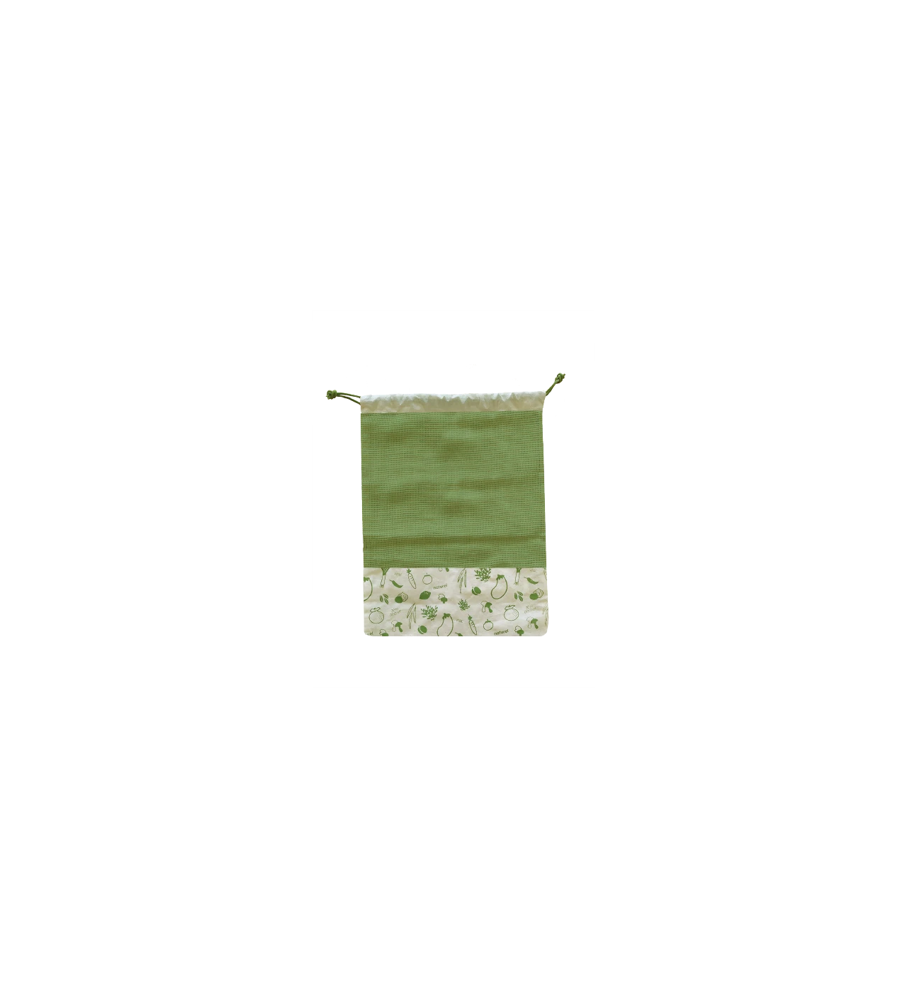 Alternative durable aux sacs jetables en plastique ou en kraft, le sac en tissu est fabriqué en coton biologique et possède une partie supérieure en filet de coton ce qui garantira une meilleure conservation de vos fruits et légumes. Le sac en coton de couleur verte aux motifs originaux est équipé d'un cordon de serrage pour maintenir en place vos divers aliments.