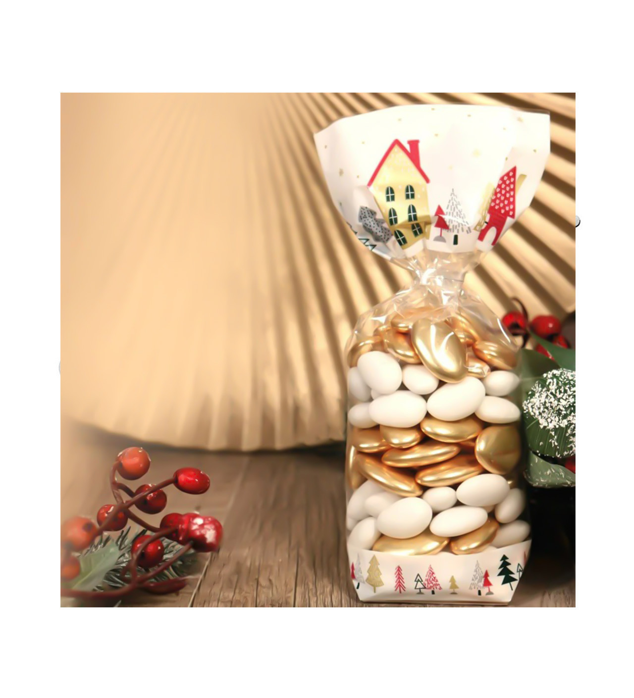 Avec leurs motifs de village de Noël aux teintes festives blanc, rouge, or et noir, ces sachets bonbon transforment chaque gourmandise en un véritable petit cadeau à offrir. Ces 5 sachets transparents sont accompagnés de leurs attaches et d’un fond cartonné, offrant une présentation soignée, pour un emballage festif, prêt à faire plaisir.