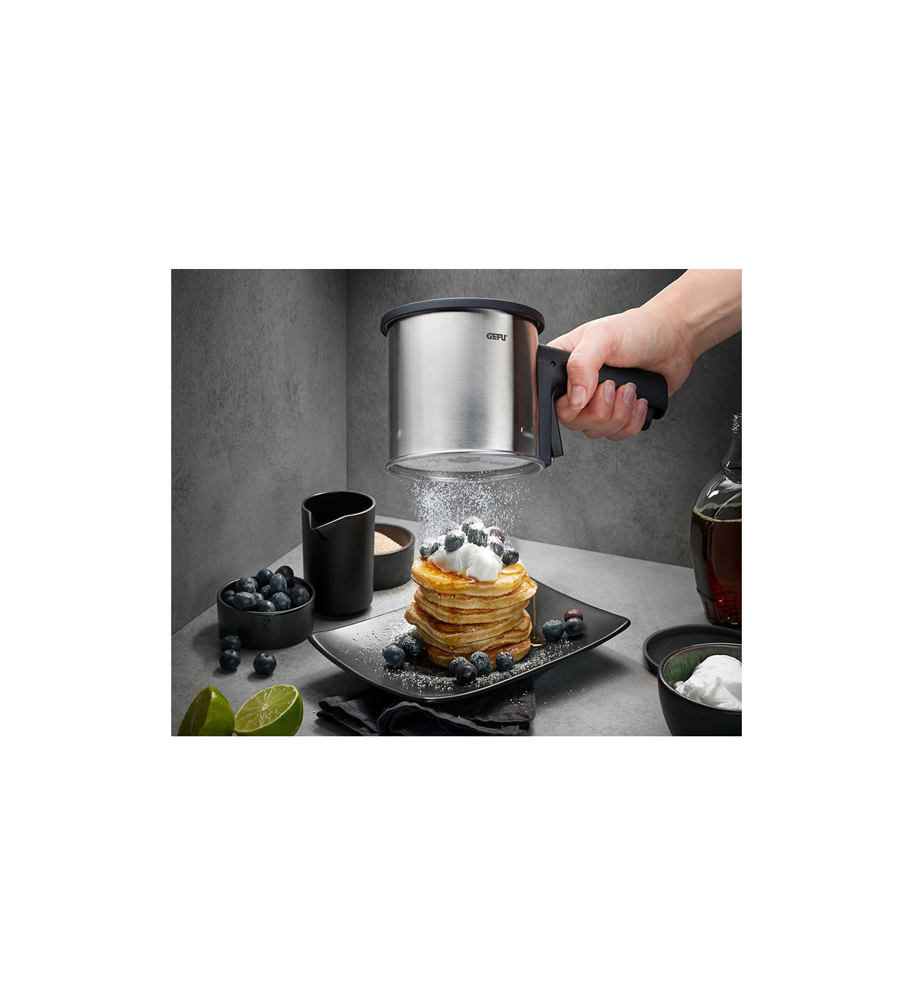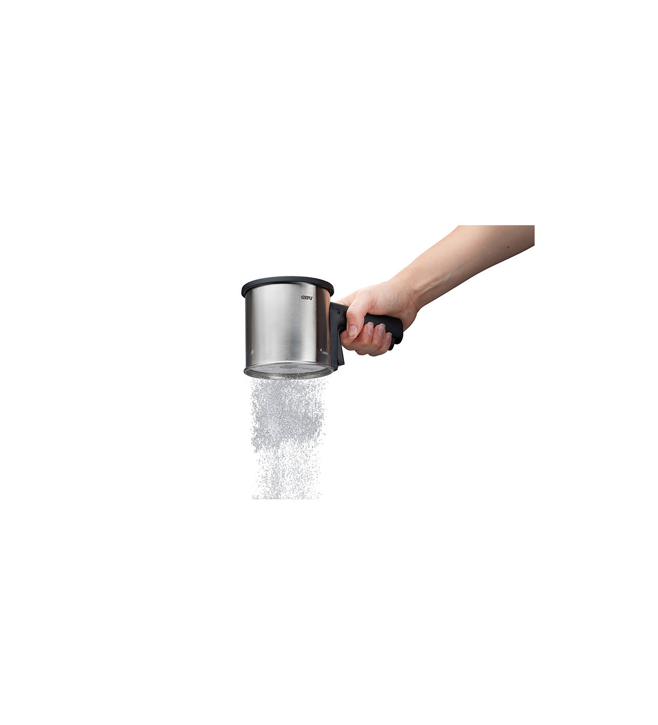 La saupoudreuse en inox Gefu est l’ustensile parfait pour décorer les gâteaux et tartes, mais elle peut aussi servir à tamiser de la farine pour des macarons par exemple.