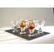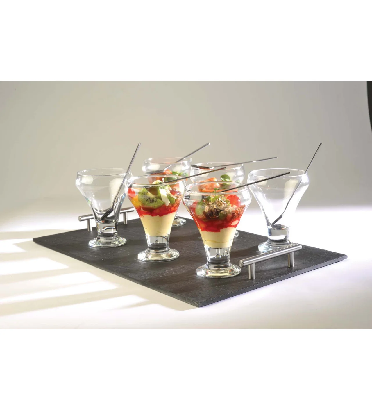 Ce service entrées et desserts proposé par LeBrun se compose de 13 pièces. Avec 6 coupelles en verre Hawaï, 6 pelles à glace, exposé sur un élégant plateau en ardoise avec ses poignées métalliques.