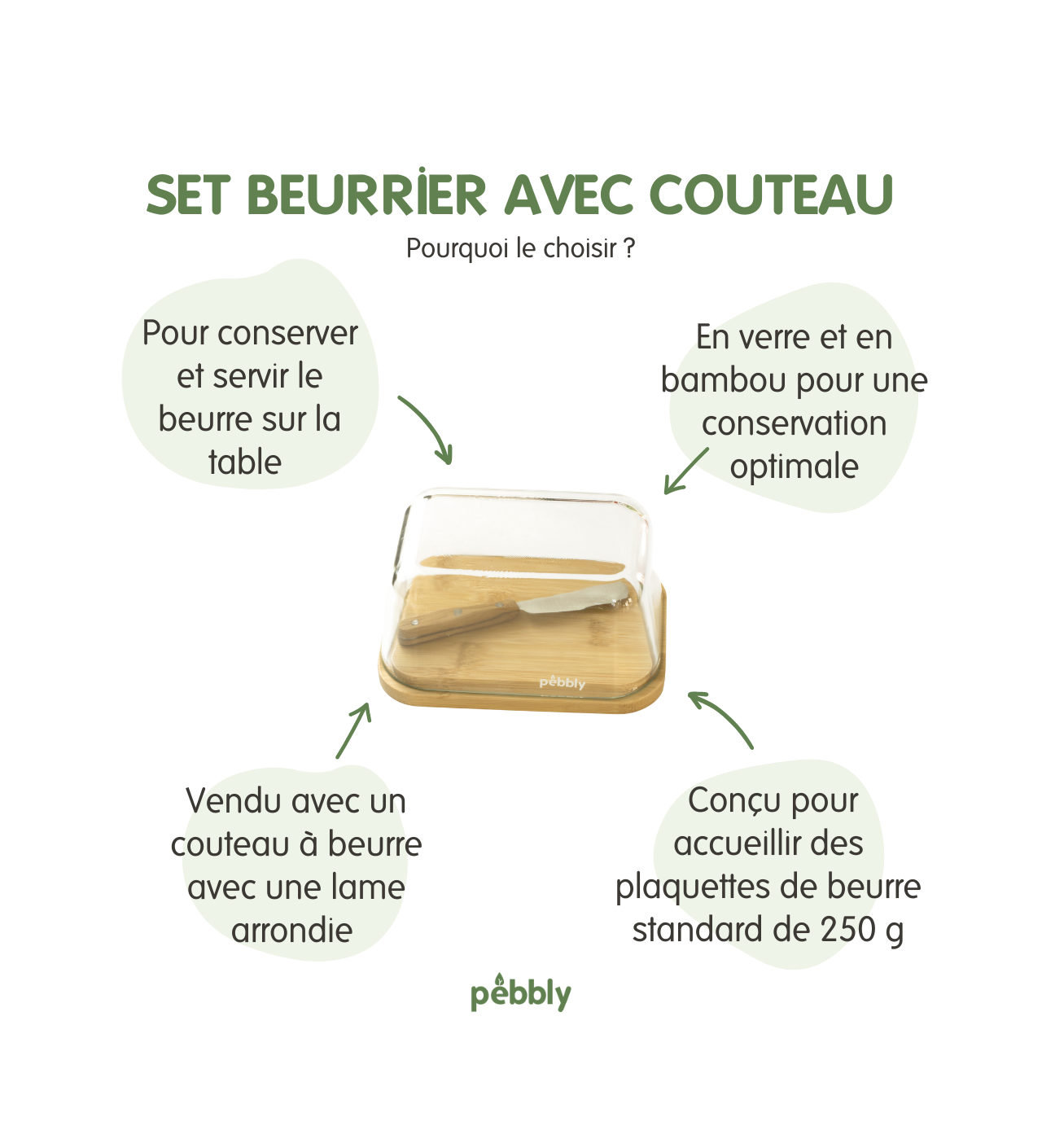 Pour diminuer la dose de plastique dans votre cuisine tout en ajoutant une touche esthétique, choisissez le set beurrier en verre et bambou Pebbly !