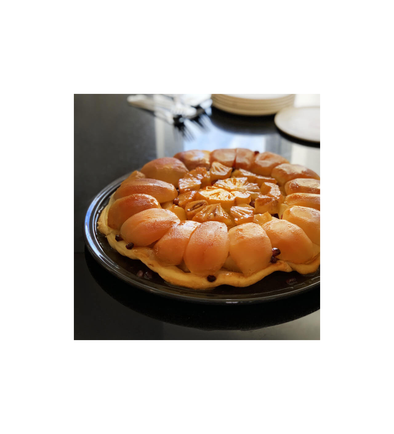 Le principe de la tarte tatin étant de la renverser pour la servir, ce set comporte un plat en céramique, prévue pour l’accueillir et la présenter aux invités. L’émail fusain, d’un noir subtil et distingué, saura souligner comme d’un trait de crayon, les lignes de votre tarte pour la sublimer.