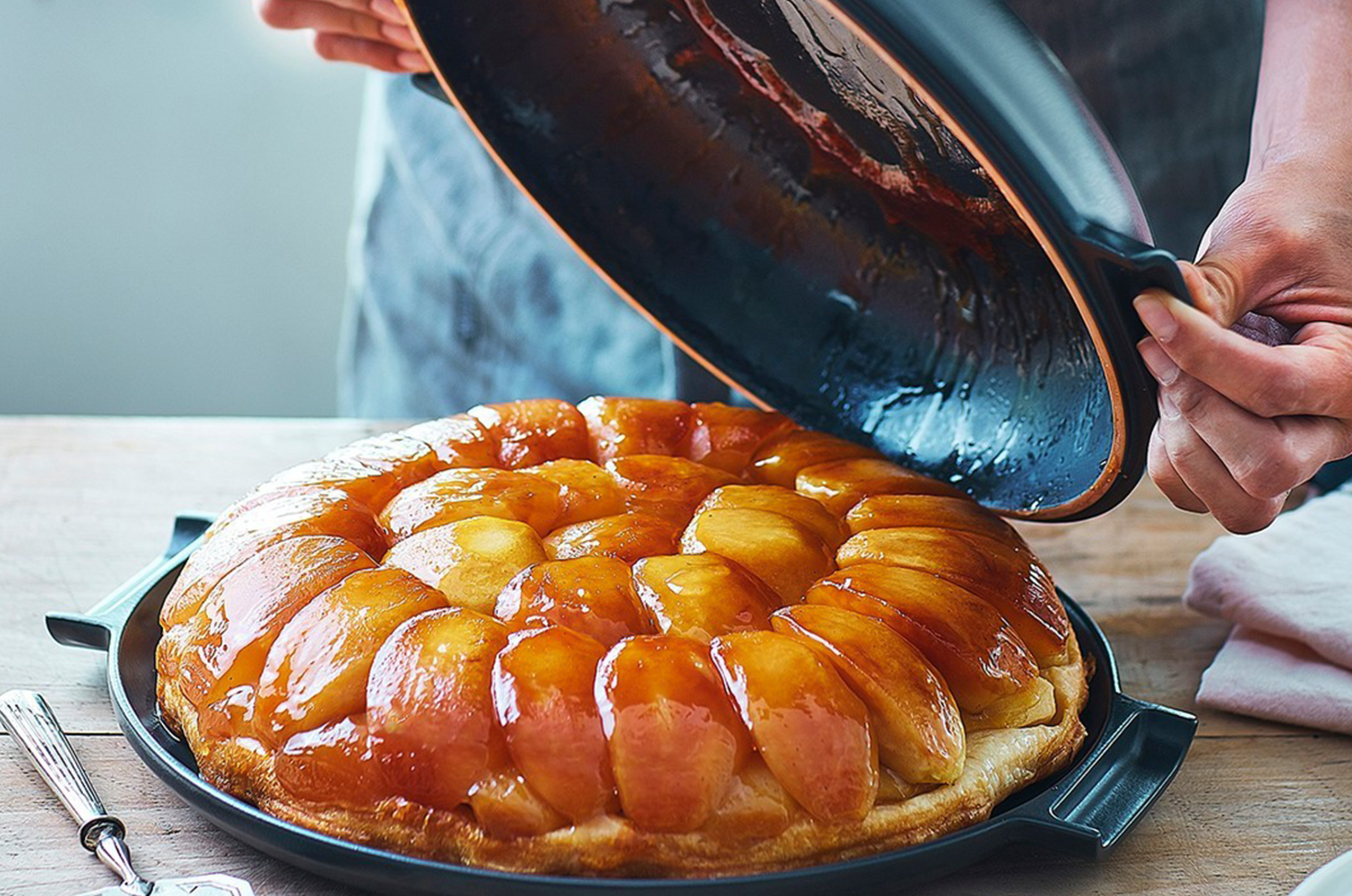 Disposez vos pommes et recouvrez-les de pâte, avant d’enfourner le moule dans le four. La forme du moule en céramique assurera une cuisson parfaite de vos pommes, qui se confieront dans le caramel, pour être fondantes à la dégustation.