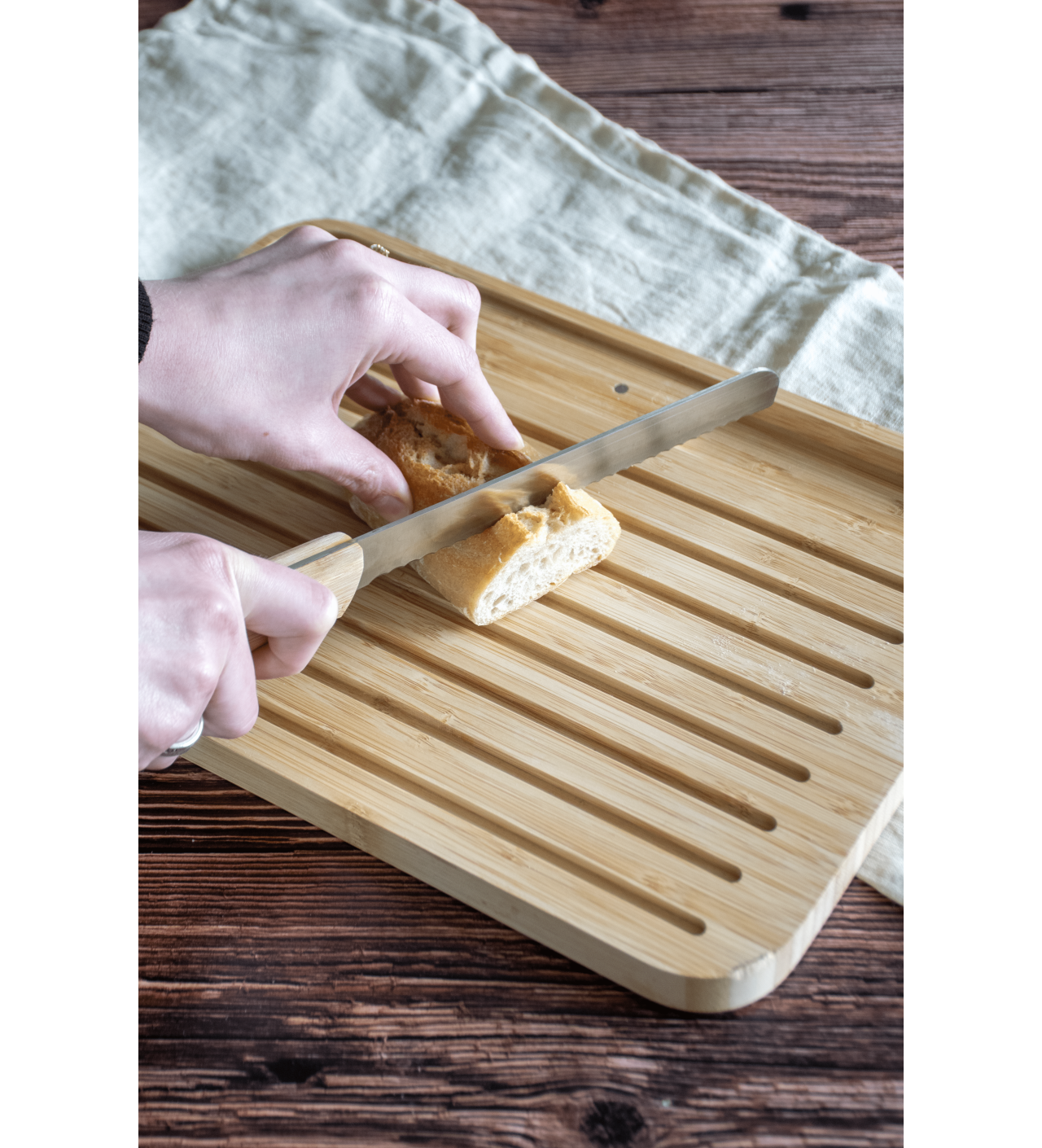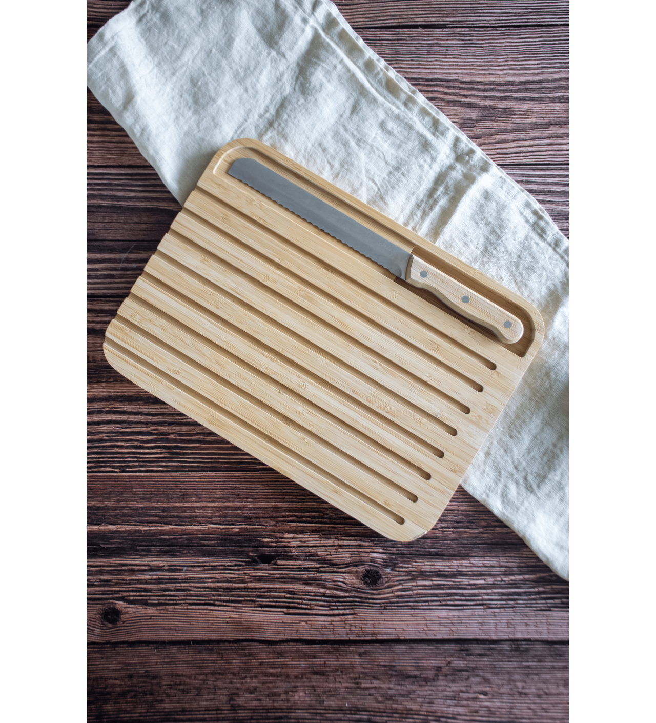 Pratique, garder toujours votre couteau à pain à portée de main grâce au porte-couteau magnétique inclut dans la planche rainurée.