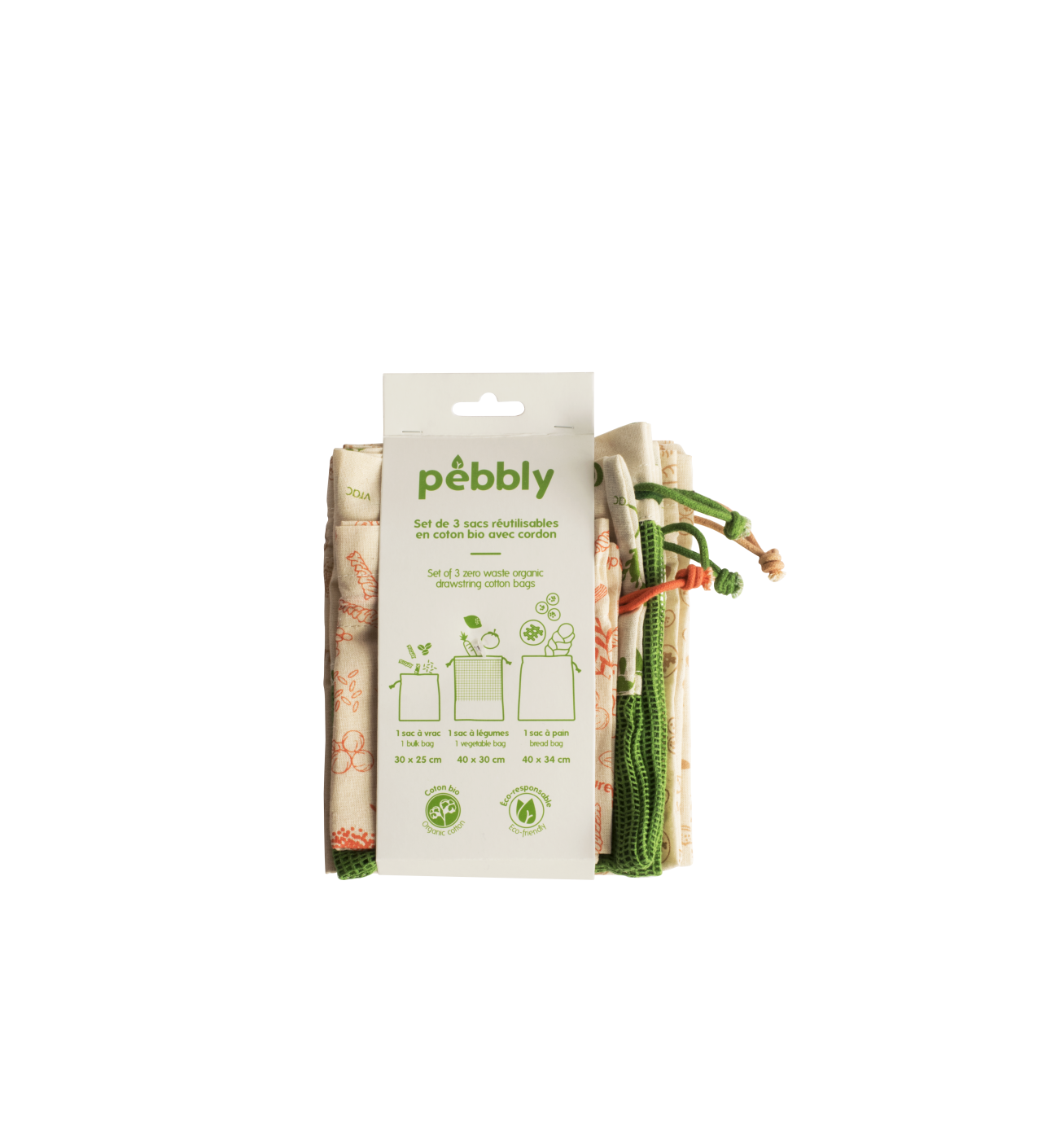 Dans ce lot proposé par Pebbly, vous retrouverez un sac à vrac, un sac à légume et un sac à pain. Les sacs en tissu sont fabriqués en coton biologique naturel à forte densité et sont équipés d'un cordon de resserrage.