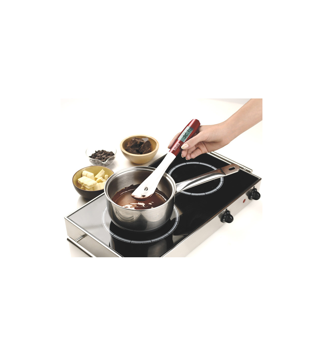 Spatule en Silicone permettant de mesurer la température grâce à son thermomètre intégré. La spatule thermomètre est idéale pour surveiller les cuissons tout en remuant la préparation. La Spatule Thermomètre amovible Yoocook est un ustensile particulièrement adapté pour le travail du Chocolat, d'une crème ou d'un caramel. Muni d'un embout en forme de spatule ainsi que d'un embout cuillère, la Spatule Thermomètre vous permet de mesurer le température tout en remuant, pour obtenir une température idéale au coeur même de votre préparation.