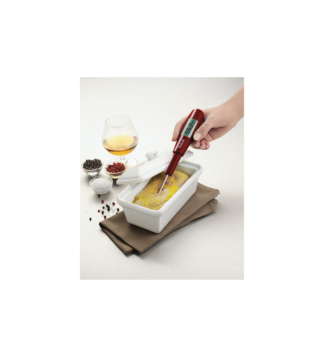 L'embout est amovible, offrant une deuxième utilisation à cet ustensile comme thermomètre de cuisine électronique pour vos viandes, foie gras mais également de vos terrines afin de mesurer la température de vos préparations et de suivre la cuisson à coeur.