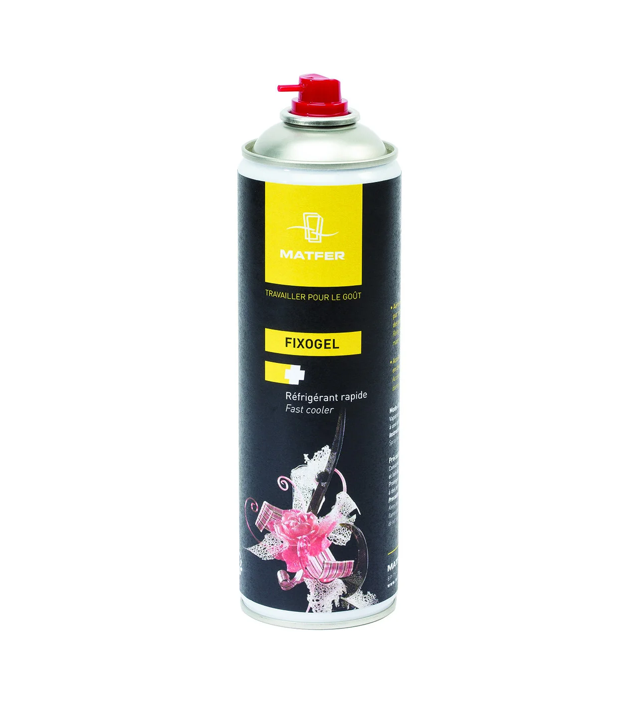 Vous souhaitez monter rapidement une belle structure chocolatée ou sucrée ? Pour gagner du temps, utilisez le Spray froid Fixogel ! Cette bombe à froid permettra de refroidir rapidement une pièce en chocolat pour la coller avec facilité à une autre pièce.