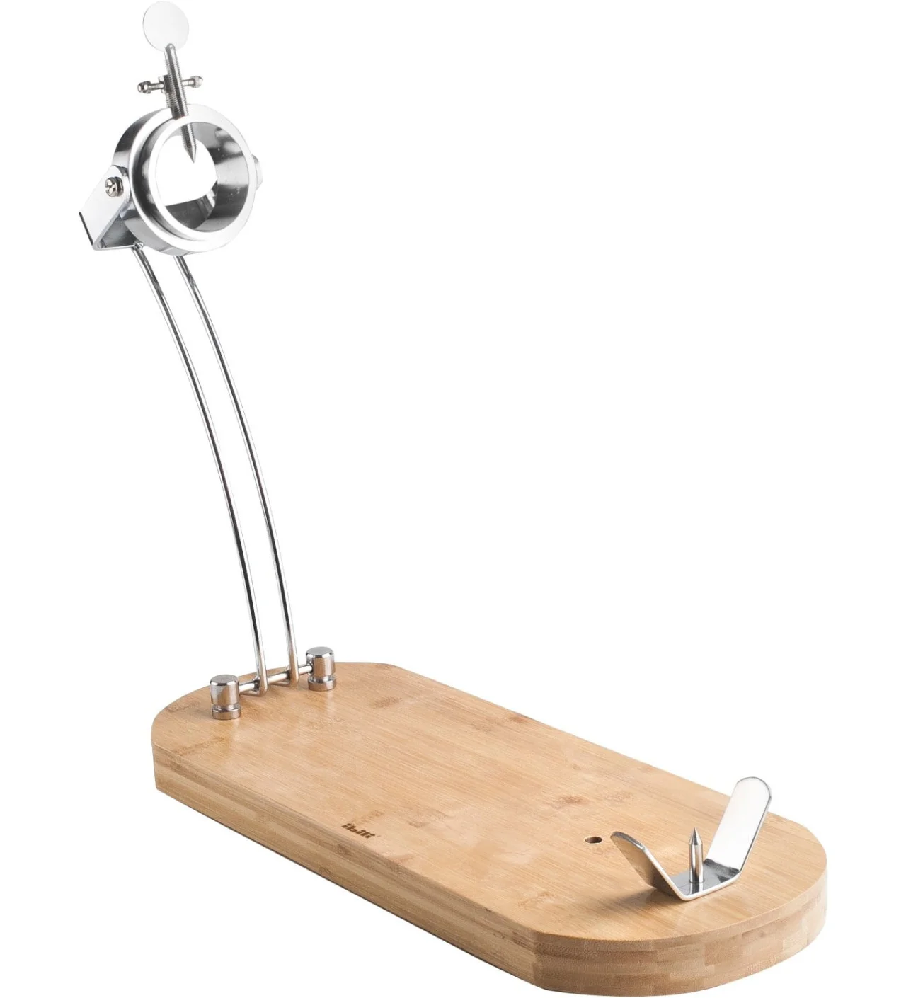 La base de ce support à jambon Ibili est faite de bambou avec des pieds en silicone pour le maintenir bien en place. Les parties mouvantes sont quant à elles faites en inox. Facile à ranger et à nettoyer, la griffe à jambon Maestro est un indispensable pour tous les amoureux incontestés de charcuterie.