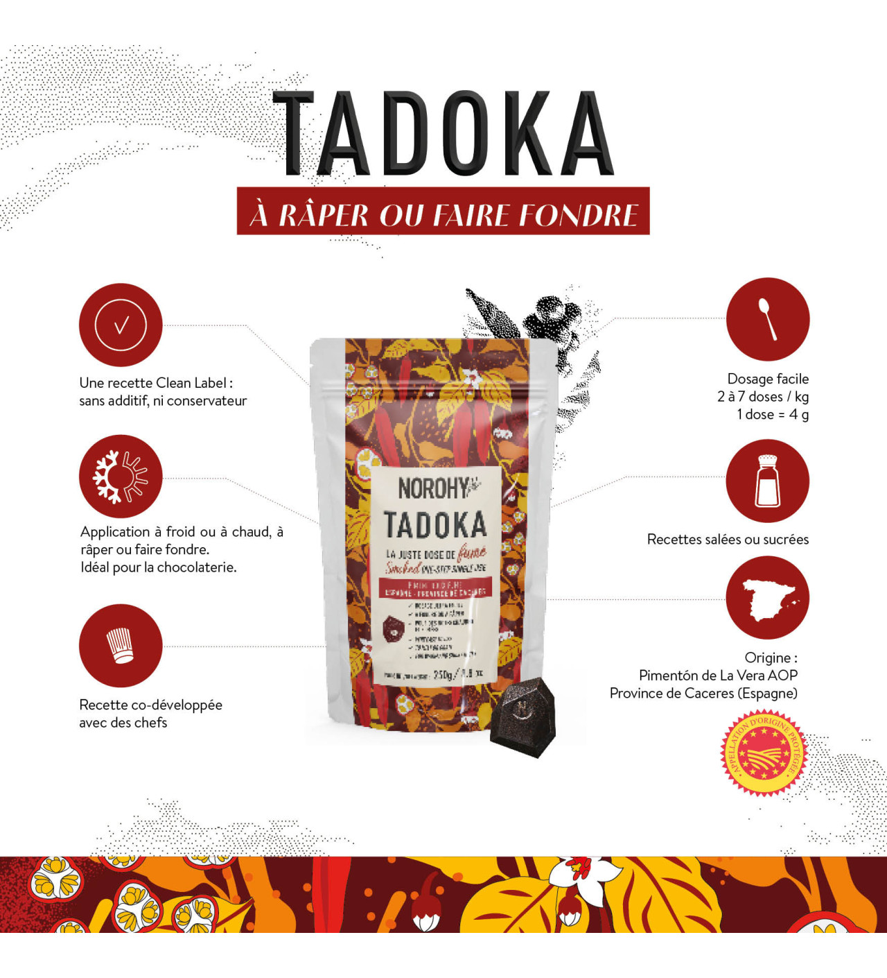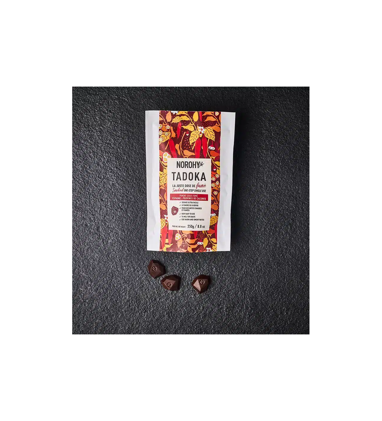 Présenté sous forme solide, ce petit galet d’assaisonnement est polyvalent et simple à utiliser. À râper à froid ou à faire fondre selon vos envies, le Tadoka fumé sublime aussi bien les créations sucrées (ganaches, pralinés, caramel, chocolat…) que les recettes salées (soupes, sauces, légumes rôtis, viandes…).