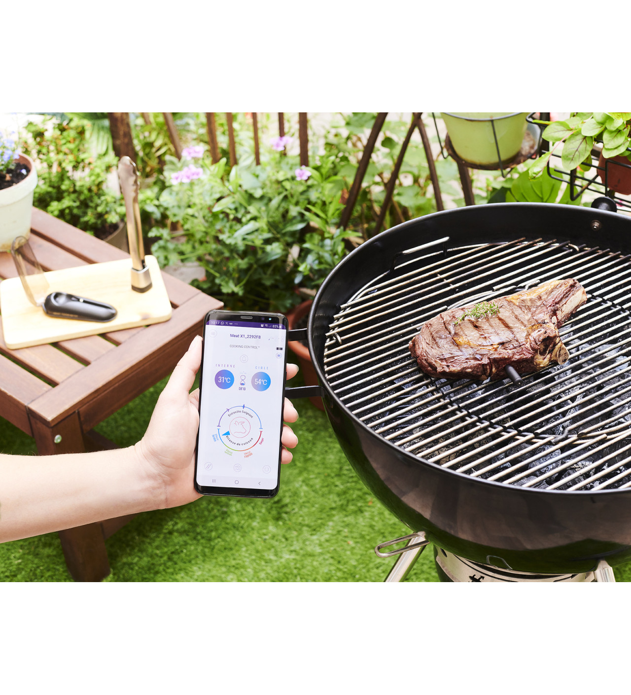 Meat°It, ce n'est pas simplement un thermomètre, il s'agit de tout un ensemble proposé par la marque Mastrad. D'abord, il y a la sonde de cuisson 100% sans fil, en inox et céramique de zircone (alias le dioxyde de zirconium), résistante à des températures extrêmes. Pour vous donner une idée de la résistante du zircone, sachez par exemple que seul le diamant peut l'aiguiser s'il est utilisé en coutellerie ! À ce matériau, on ajoute une technologie de pointe avec des capteurs mesurant la température à cœur, la vitesse de cuisson et le temps restant, le tout s'affichant sur l'application Meat°It à télécharger sur votre smartphone pour une connexion Bluetooth. Sur cette application, vous avez également accès à des idées recettes proposées par Mastrad.