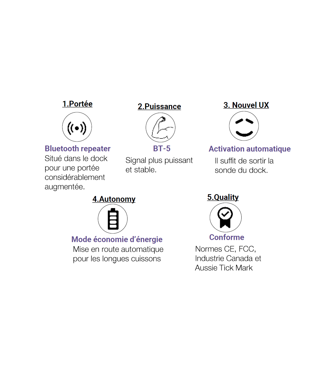 Pour finir de vous convaincre, l'application Meat°It du thermomètre de cuisson connecté Mastrad vous permet de personnaliser l'alarme de fin de cuisson. De plus, l'activation est automatique, il suffit de sortir la sonde du dock et elle s'active. Dans le même principe, le thermomètre possède un mode d'économie d'énergie pour les longues cuissons permettant d'optimiser la charge (1 charge = 24h d'utilisation). Enfin, le thermomètre de cuisson connecté est conforme aux normes CE et possède une garantie de 2 ans.