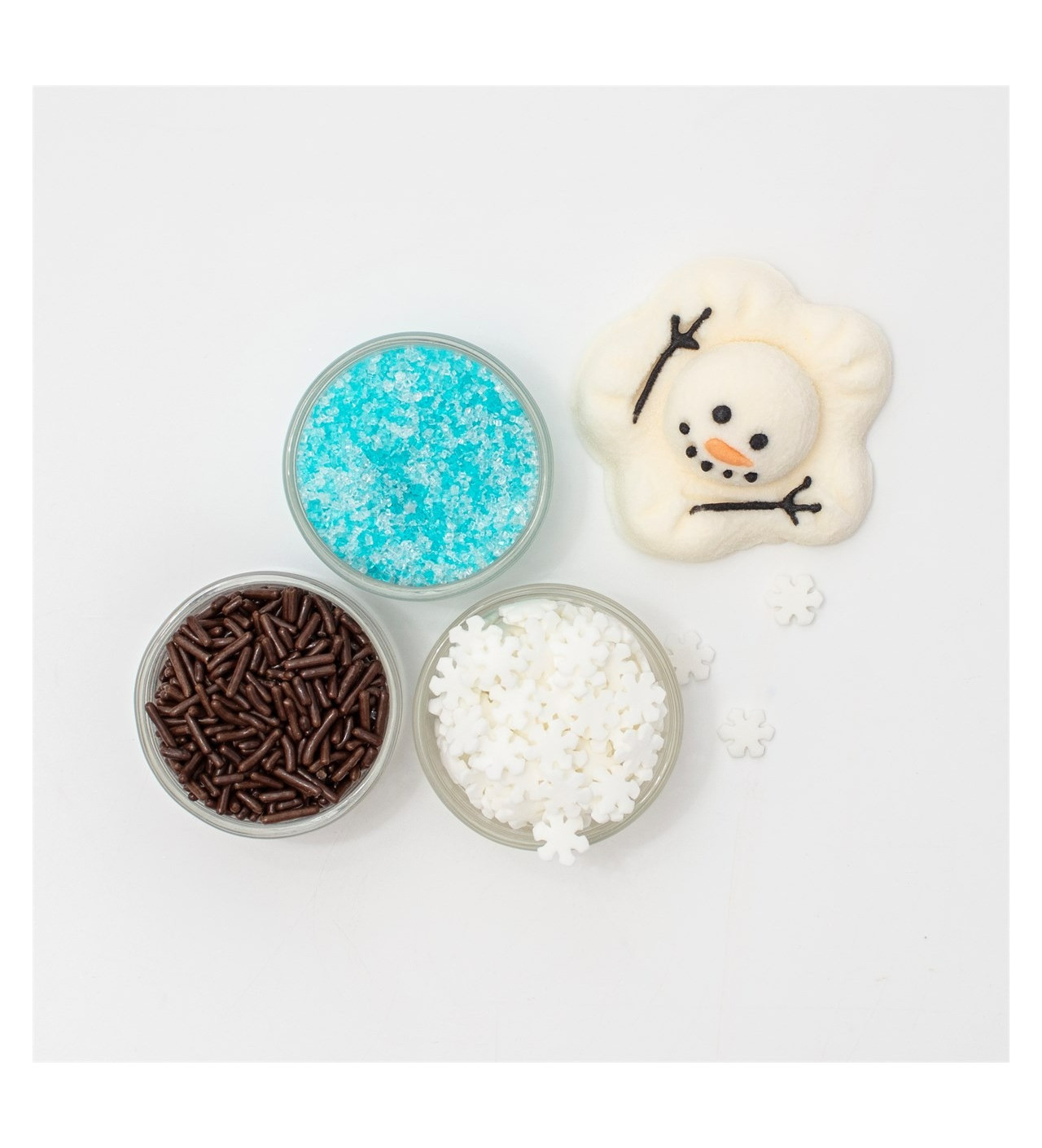 Le coffret décor chocolat chaud Noël comprend également trois pots refermables de toppings pour varier les plaisirs : un pot de paillettes comestibles bleues et blanches, un pot de décors en sucre flocons de neige et un pot de vermicelles au chocolat.