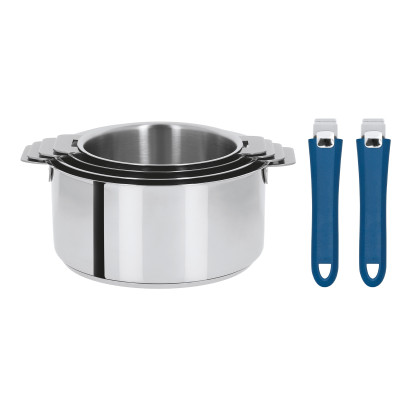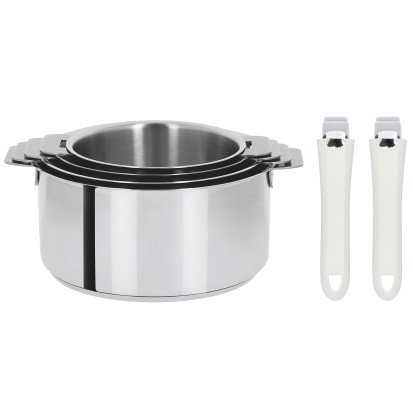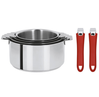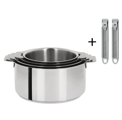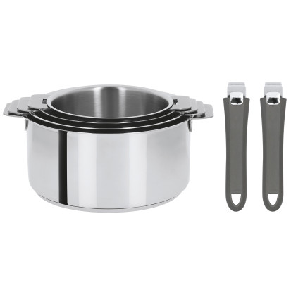 Collection Mutine Manche amovible Cristel - Cristel a créé la collection Mutine amovible. Cette collection à la fois basique tout en inox et de qualité professionnelle sera idéale pour votre cuisine. Les faitouts, casseroles, poêles et sauteuses de la collection Mutine amovible de Cristel s'empilent parfaitement pour un gain de place appréciable. Ces ustensiles en inox trouveront facilement leur place dans votre cuisine.