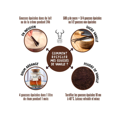 La gousse de vanille se présente sous la forme d'un bâtonnet brun à noir et très brillant. Pour en extraire toutes les saveurs et ne rien perdre de cette épice précieuse, il suffit de fendre la gousse de vanille en 2 dans le sens de la longueur à l'aide d'un couteau d'office à lame lisse, puis de racler les grains en passant le fil du couteau sur chaque moitié de gousse de vanille à la perpendiculaire et en appuyant délicatement. Rien ne se perd puisque même vidée de ses grains, la gousse de vanille peut être infusée (lait, eau, alcool), incorporée à du sucre semoule pour faire du sucre vanillé ou encore réduite en poudre pour parfumer les plats et assaisonnements.