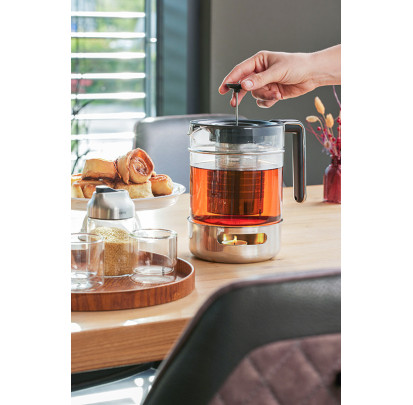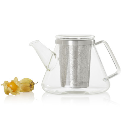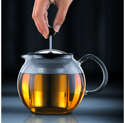 La théière en verre Assam se reconnaît par ses lignes arrondies. Dotée d'une anse transparente, elle renferme un filtre avec un piston qui permet de piéger les feuilles de thé au fond.